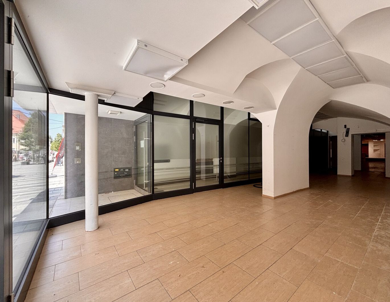 Schon auf den ersten Blick verraten die hochwertigen Glasportale (zwei Eingänge!) , dass sich auch im Inneren Stil und Qualität fortsetzen. Ursprünglich als Modestore konzipiert, finden sich noch Garderoben, Präsentationsflächen sowie eine Rampe für den barrierefreien Zugang zum hinteren Raum in der Immobilie