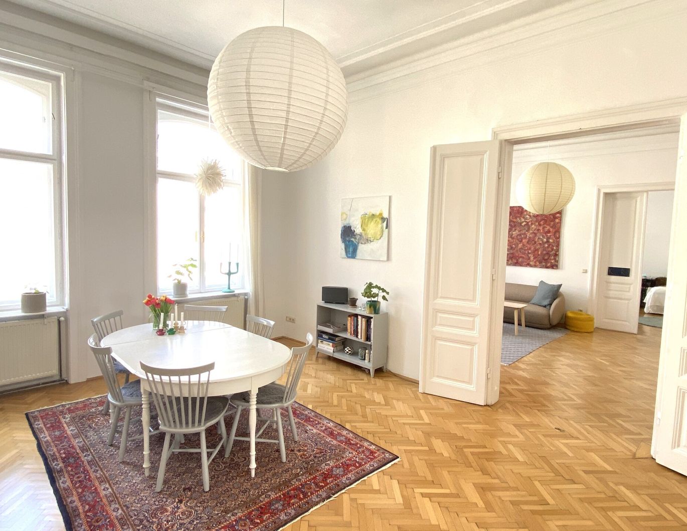 sowie die mit Stuck verzierten, hohen Zimmerdecken. Die Zimmer sind größtenteils getrennt begehbar, zwei davon sind ruhig hofseitig ausgerichtet. Die Küche ist vollständig ausgestattet und verfügt über einen Herd mit Ceranfeld und Backrohr, eine Spüle, einen Geschirrspüler, eine Kühl-/Gefrierkombination sowie weiße Küchenkästchen. Die Wohnung bietet zwei Badezimmer: Ein großes, geräumiges Badezimmer ist vom Vorzimmer aus zugänglich und mit einer Eckbadewanne, einer Dusche sowie einem Waschbecken ausgestattet. Das zweite Badezimmer ist von einem der hofseitigen Zimmer aus begehbar und verfügt über eine Dusche, ein Waschbecken sowie eine Toilette. Die Beheizung erfolgt über eine Gasetagenheizung. Die Wohnung wird befristet auf 5 Jahre vermietet. Die