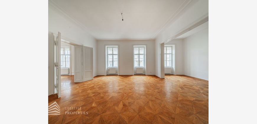 Zur Vermietung gelangt eine wunderschöne 5-Zimmer Wohnung im 1. Wiener Gemeindebezirk. Sie hat ca. 214 m² und befindet sich im 3. Stock mit Mezzanin eines schönen Altbaus aus dem Jahr 1871, ist bequem mit dem Lift erreichbar und gliedert sich in ein Entrée, 5 separat begehbare Zimmer, eine Küche, ein Bad und zwei WCs. Die Wohnung wird mit einer Gasetagenheizung beheizt. Traumhafter Parkettboden befindet sich in den Wohnräumen, die Nebenräume sind verfliest. Sie betreten die Wohnung und befinden sich im großen Entrée. Von diesem gelangen Sie linkerhand in das Esszimmer mit angegrenzender Küche. Ebenfalls links vom Vorraum befinden sich 2 WCs. Rechts vom Vorraum befindet sich der großzügige Salon. Über einen Gang, welcher eine zentrale Verbindung schafft, erreichen Sie die weiteren 3 Zimmer und auch das Badezimmer, welches mit einer Dusche und einer Badewanne ausgestattet ist.