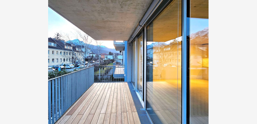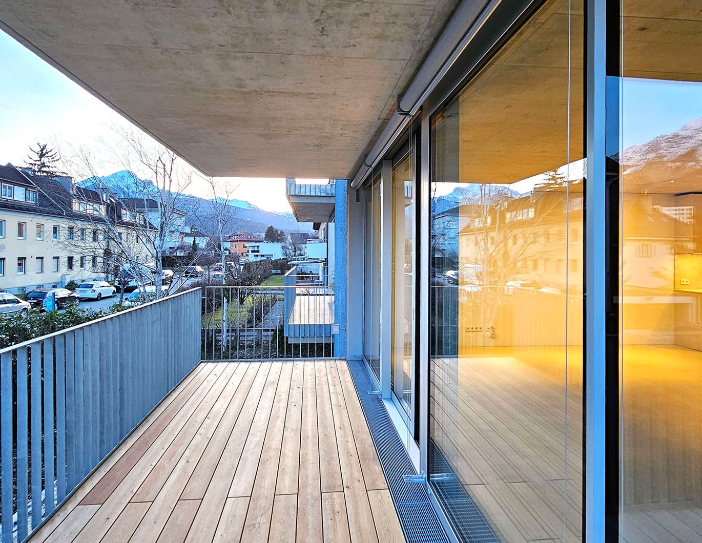 Die Wohnung verfügt über 59 m² Wohnfläche mit klarer, funktionaler Raumaufteilung. Raumhohe Türen tragen zu einer stilvollen Erscheinung und einem großzügigen Raumgefühl bei. Raumhohe Fenster sorgen für maximalen Lichteinfall. Die über Eck verlaufende Wohnzimmerverglasung sorgt für eine fließende Erweiterung des Wohnzimmers in den großzügigen Balkon mit 15 m², welcher einen zwei Meter tiefen Aufenthaltsbereich mit Bergblick bietet und durch den Baumbestand und die gepflegten Grünflächen direkt am Grundstück zusätzlich aufgewertet wird. Das Schlafzimmer öffnet sich über ein raumhohes französisches Balkonfenster nach außen und bietet Raum für ein Doppelbett sowie eine breite Kastenfront.