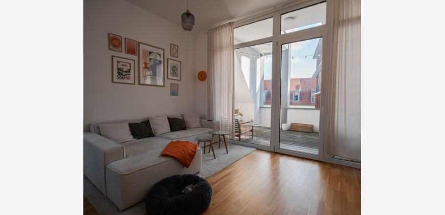 Diese stilvolle Dachgeschosswohnung vereint modernes Design mit großzügigem Wohnkomfort. Hohe Decken und große Fensterfronten schaffen ein lichtdurchflutetes, offenes Raumgefühl. Die hochwertige Design-Küche mit Markengeräten schließt direkt an den Wohn- und Essbereich an und bietet einen herrlichen Blick auf die rund 12 m² große Loggia. Das elegante Badezimmer mit Badewanne und Dusche lädt zum Entspannen ein und rundet das luxuriöse Ambiente ab.