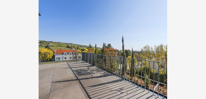 Über einen kurzen Gang gelangen Sie zu einem WC mit Vorraum und Handwaschbecken, hin zu Ihren privaten Räumlichkeiten: Mit Blick zu den Weinbergen befindet sich der ca. 28 m² große Masterbedroom der Wohnung. Ein großes Badezimmer, welches mit hochwertigem Sanitär, wie Badewanne, Walk-In-Dusche, WC und Doppel-Waschbecken