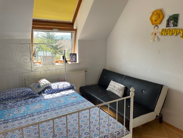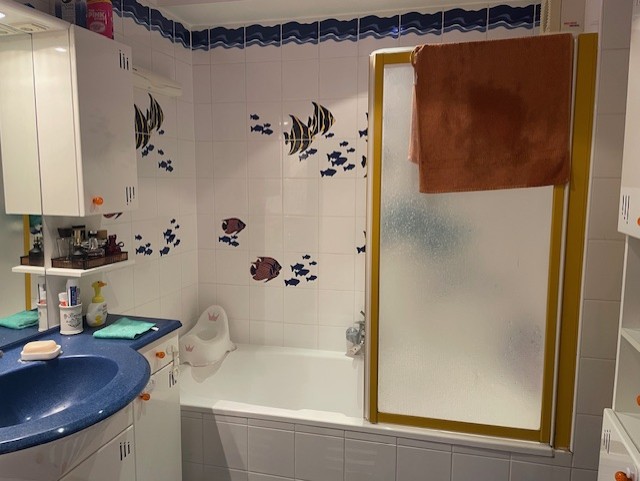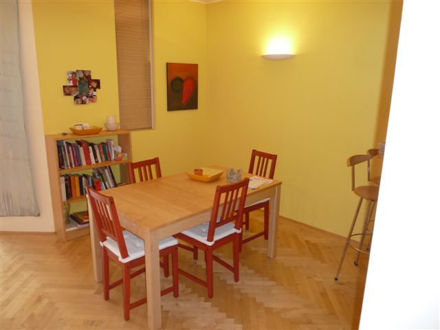 Bad mit Wanne, WC mit Handwaschbecken, Boden: Parkett und Verfliesung, Jalousien, Küche