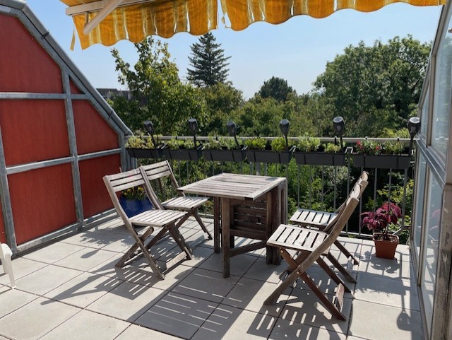 Sehr schöne Terrasse mit Blick ins Grüne, absolute Ruhelage und dennoch sehr zentral.