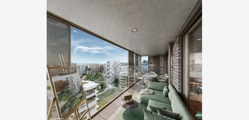 Insgesamt entstehen 143 Eigentumswohnungen mit Wohnflächen zwischen ca. 45m² und 110 m² und 2-5 Zimmern, sowie 2 Geschäftslokale. Zusätzlich werden 10 Hobbyräume zum Erwerb angeboten. Die kompakte Bauform sorgt großteils für zweiseitig belichtete Wohnungen, die jeweils über zwei Freiflächen verfügen: