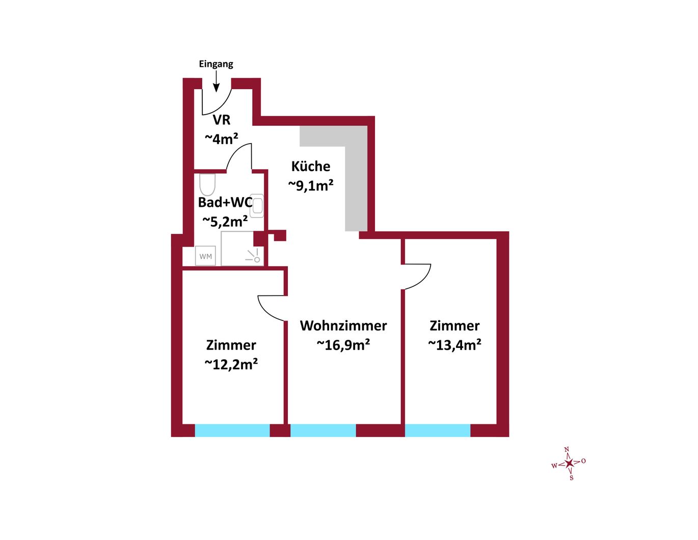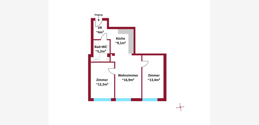 Aufteilung der insgesamt ca. 61 m² großen 3-Zimmer Wohnung: