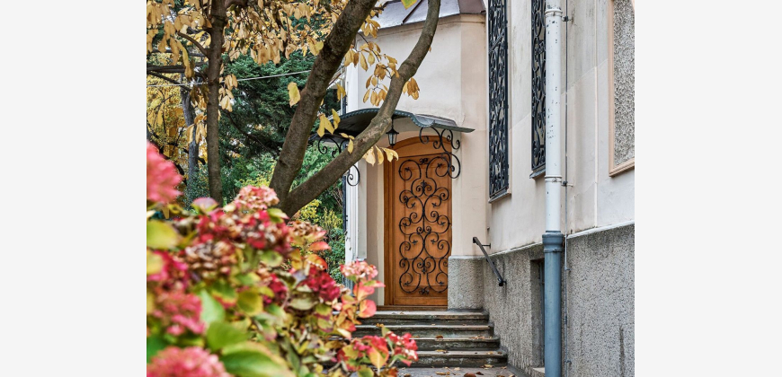Zu den weiteren Stockwerken gelangt man über ein beeindruckendes Marmorstiegenhaus. Das Obergeschoss , zuletzt um 2005 saniert, präsentiert sich mit einem hellen, großzügigen Wohnsalon und vier weiteren Räumen, während das Dachgeschoss mit vier gemütlichen Zimmern und zwei Terrassen einen atemberaubenden Ausblick über die Baumkronen bietet. Die Villa verfügt über insgesamt vier Badezimmer, sieben WCs, eine erneuerte Gaszentralheizung, Klimaanlage