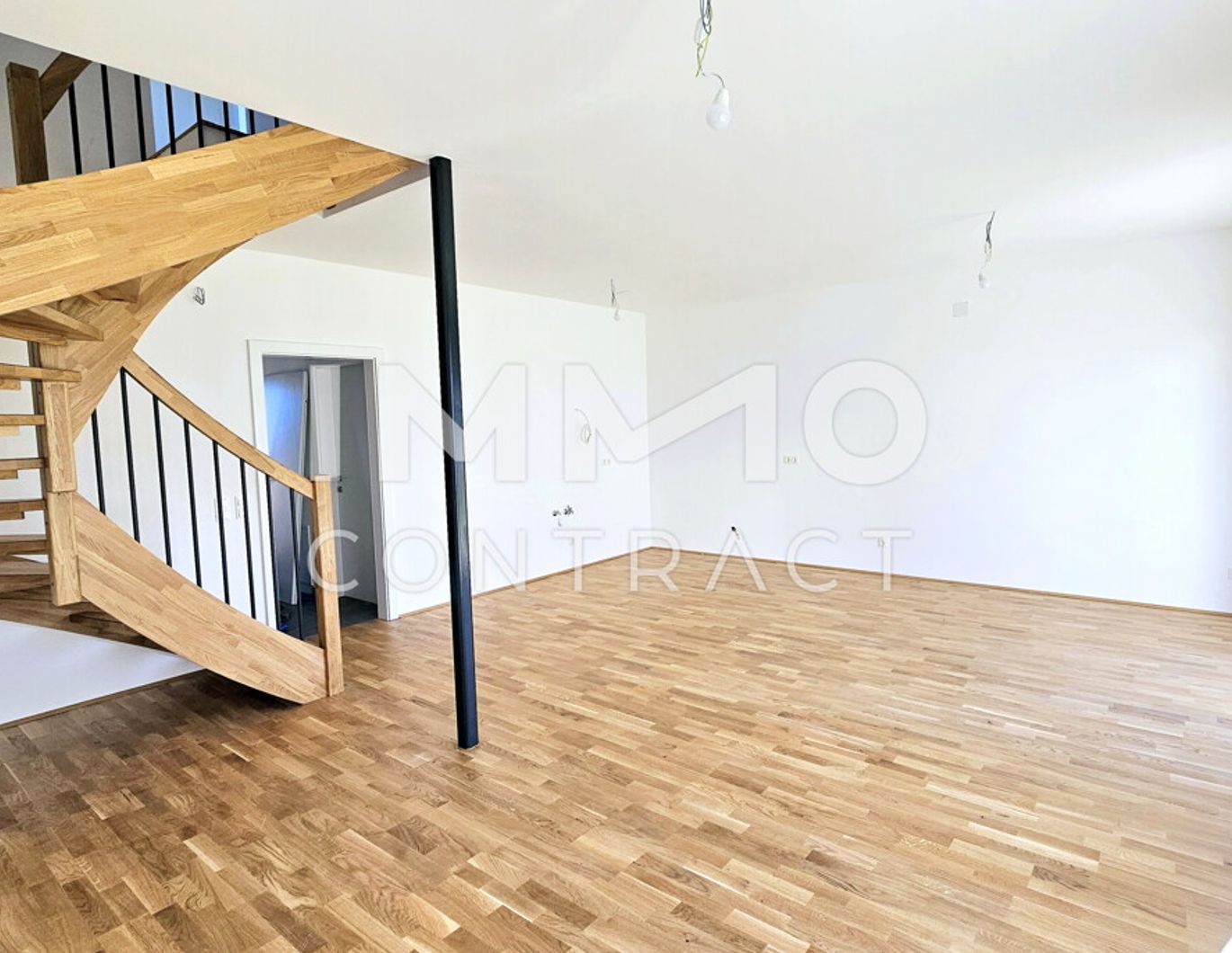 Das Erdgeschoß besteht aus einem großen Wohn-/Esszimmer mit integrierter Küche, Gäste-/Arbeitszimmer, Technikraum, Vorzimmer und WC. Die Küche ist nicht möbliert