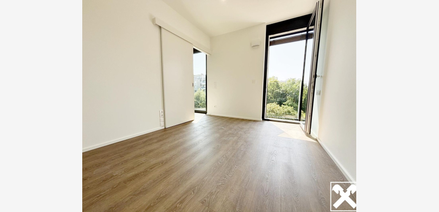 Diese smarte Zweizimmerwohnung verfügt über ein Wohnesszimmer mit vollausgestatteter Küchenzeile, ein Schlafzimmer, ein Badezimmer, ein separates WC, sowie einen zugeordneten Einlagerungsraum. Die bodentiefen Fenster sind als französische Balkone ausgeführt und erzeugen ein offenes Wohngefühl. Besonders charmant ist der über Eck geführte französische Balkon im Schlafzimmer.