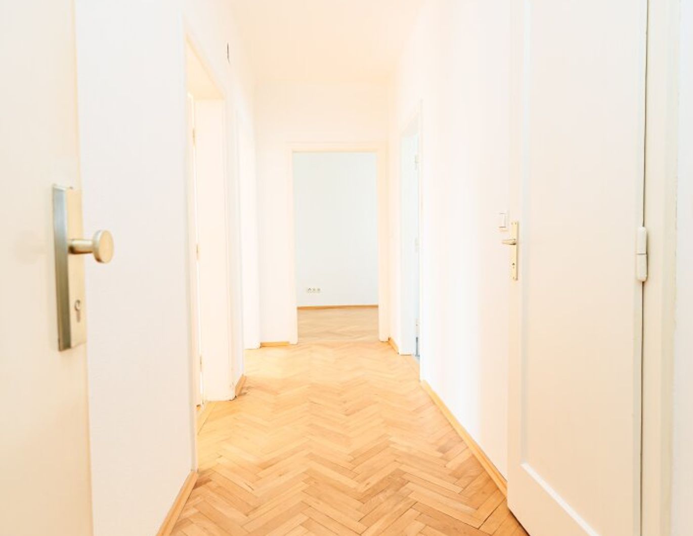 Schon beim Betreten der Wohnung spüren Sie den hochwertigen Charakter: Der elegante Fischgrätparkettboden verleiht allen Räumen ein zeitloses, stilvolles Ambiente.