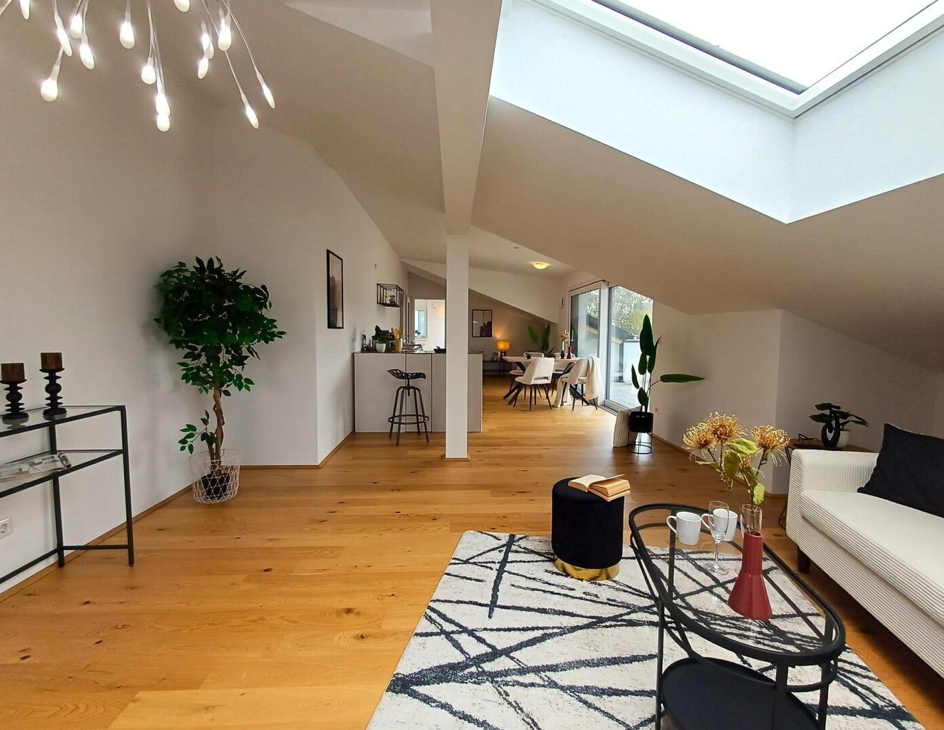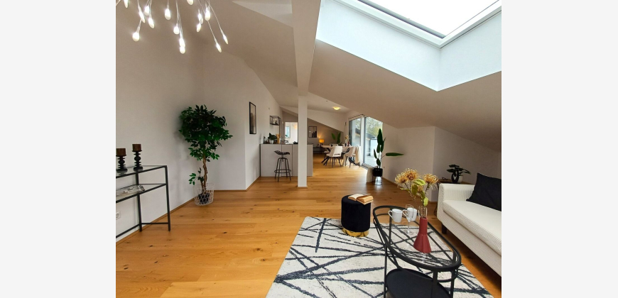 Diese traumhafte Wohnung befindet sich in einem neu errichteten Mehrparteienhaus mit lediglich fünf Wohneinheiten. Gelegen im Dachgeschoss (mit Lift) nimmt sie die gesamte Fläche der obersten Etage ein und hat somit den Charakter und Flair einer Penthousewohung. Die großzügigen 156 m² Wohnfläche bieten Raum und Platz für die Familie oder auch für platzliebende Paare oder Singles, egal ob zum Leben oder Arbeiten, alles ist möglich in einer Wohnung in der Größe eines Hauses. Großzügige Fensterflächen, insbesondere die in jedem Wohnraum installierten Dachflächenfenster sorgen für lichtdurchflutete Räumlichkeiten und bieten in Verbindung mit der heimeligen Fußbodenheizung und den Echtholzböden ein behagliches Wohn- und Lebensklima. Schrankraum, Masterbad und Zweitbadezimmer tragen das ihrige zu einem großartigen Wohngefühl bei. Der Personenlift verbindet bequem die Tiefgarage mit der Wohnung. Ein großzügige süd-westliche gelegene Sonnenterrasse mit Ausblick rundet dieses perfekte und vor allem äußerst preiswerte Angebot ab. Da es sich um einen Kauf direkt vom Bauträger handelt, ist die Wohnung im Rahmen der Fördervoraussetzungen förderungsfähig, somit kann bei Erfüllen der Bedingungen die äußerst großzügige Salzburger Wohnbauförderung als nicht rückzahlbarer Einmalzuschuss genutzt werden!