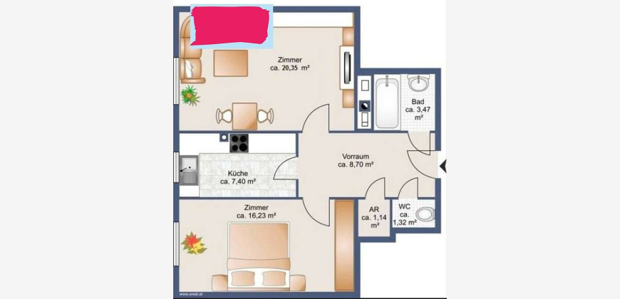 Wir vermieten eine 60m2 Wohnung, WG-geeignet im 1. Stock mit Lift, eines etwa 1980 erbauten Hauses.