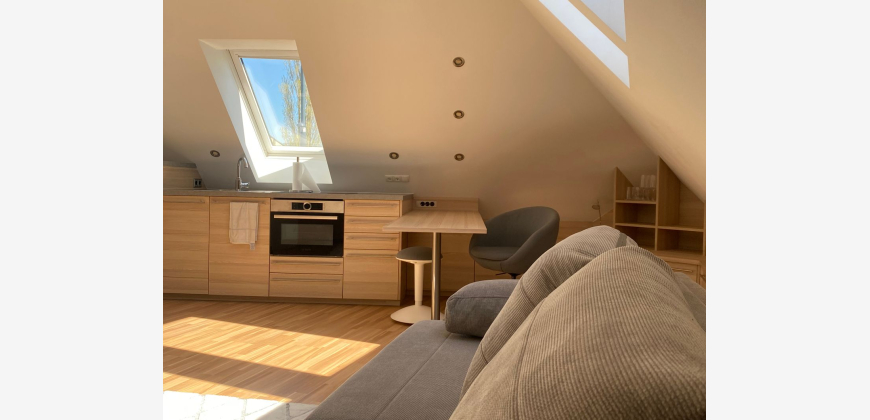 Zur Vermietung steht eine helle kleine Wohnung, ca. 37m2, bestehend aus einem Wohnraum und einem Bad/WC. Die Immobilie ist voll eingerichtet, sofort beziehbar. Moderner Dachausbau (2015) in einem charmantem, historischem Fuhrwerkerhaus.