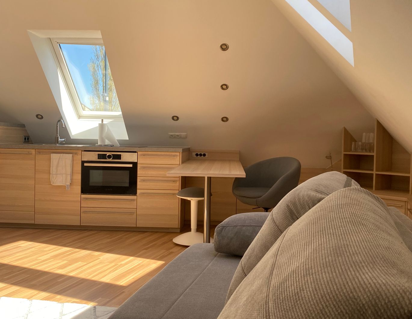 + Fußbodenheizung, Klimagerät + Maß-Einbaumöbel der Tischlerei Edelmann + Bosch- und Neff-Küchengeräte + Elektrische Dachfenster + Elektrischer Sonnenschutz + SmartTV, Staubsauger, Haarföhn, Kontaktgriller, Kaffeemaschine + Kochutensilien, Geschirr, Reinigungsutensilien