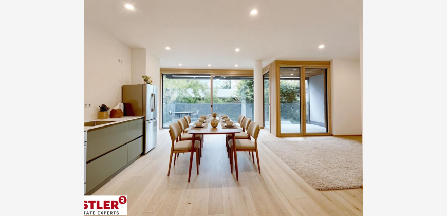 Im 1. Obergeschoss erwartet Sie eine moderne Wohnung mit ca. 75,9 m² Wohnfläche und ca. 17,7 m² Loggiaflächen. Das Herzstück bildet die ca. 35 m² große Wohnküche mit Zugang zu zwei Loggien. Zwei weitere Zimmer (ca. 13 m² und 10 m²) eignen sich flexibel als Schlaf-, Arbeits- oder Gästezimmer. Modernes Bad mit Dusche und Vollholz-Waschtisch, separates Gäste-WC, Abstellraum, Vorraum und Technikraum mit Waschmaschinenanschluss runden das Raumangebot ab. Highlights: