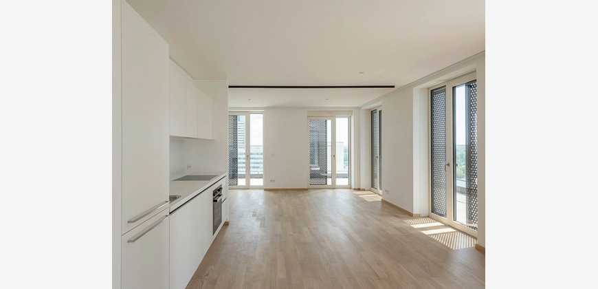 Das elegant gestaltete, 65 Meter hohe Wohnhochhaus von den Architekten Jabornegg & Pálffy besticht durch seine bodentiefen Fenster und Schiebeläden