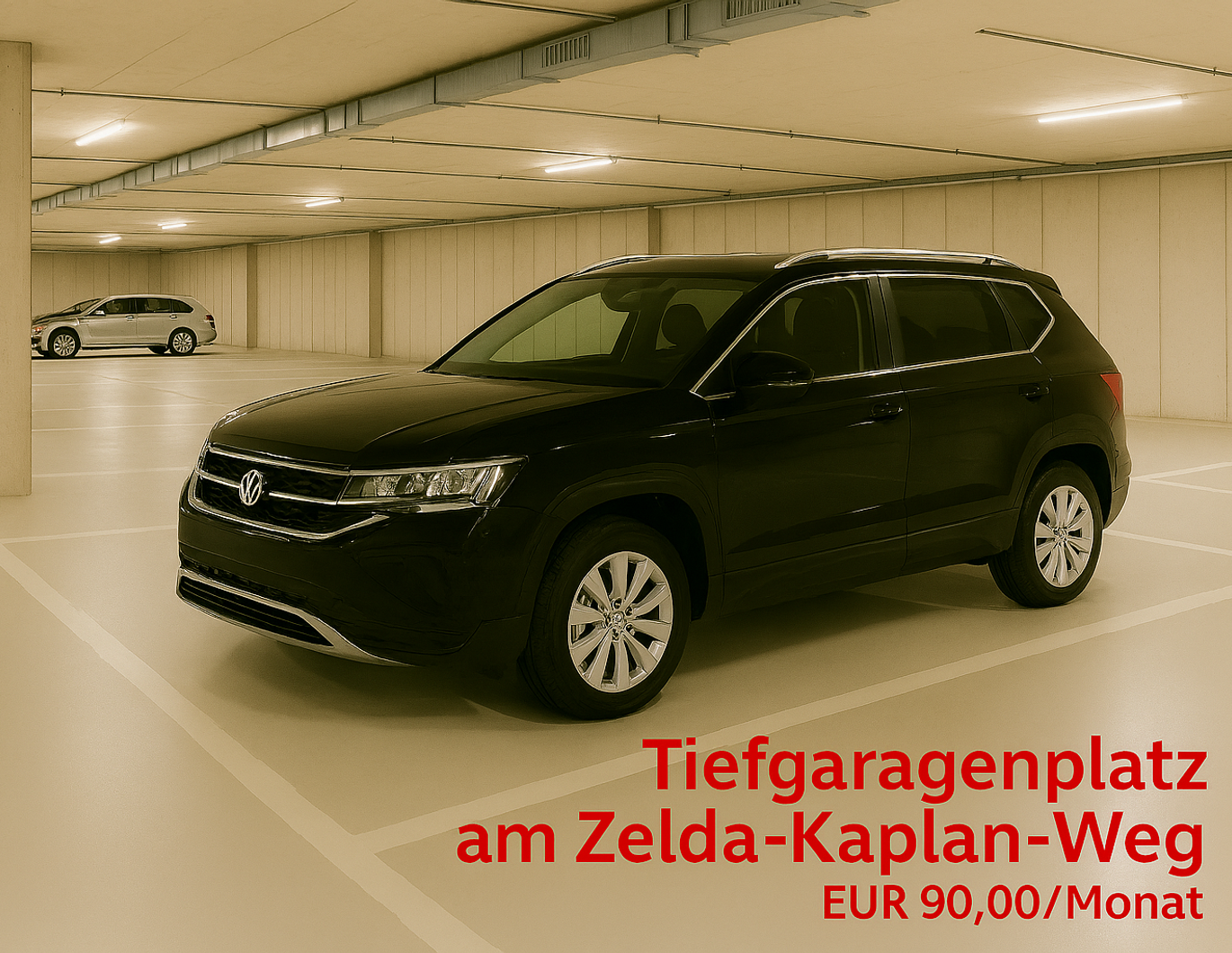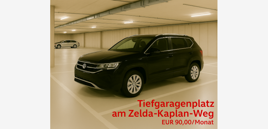 Sicherer und geräumiger Stellplatz (12,50 Quadratmeter) in gepflegter Garage im 1. Untergeschoss langfristig anmietbar (Wienerberg, Zelda-Kaplan-Weg 5).