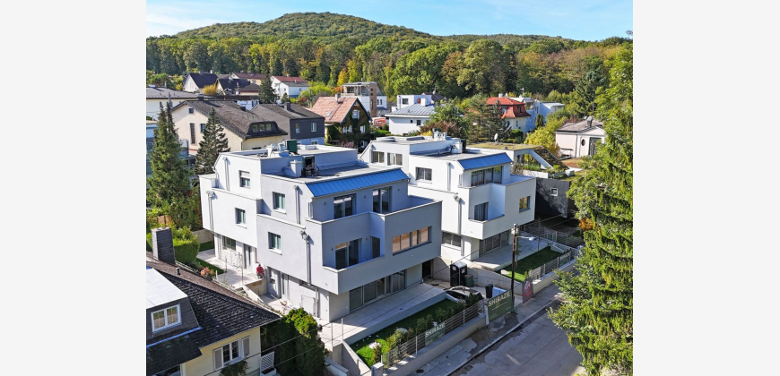 Im 14. Bezirk in der Jägerwaldsiedlung, direkt angrenzend an den Wienerwald, werden demnächst zwei Doppelhäuser in hochwertiger Ziegelmassivbauweise mit Vollwärmeschutz fertig gestellt. Die Baufirma, ein Familienbetrieb, legt in ihren Projekten besonderen Wert auf die Erfahrung der ausführenden Fachfirmen sowie auf die Qualität der Baustoffe und verwendeten Materialen. Die Doppelhaushälfte bietet ihren zukünftigen Bewohnern fast 170 m² Wohnfläche verteilt auf drei Wohnebenen, zusätzlich ist sie voll unterkellert und teilt sich mit der zweiten Doppelhaushälfte die Zufahrt zum Stellplatz in der Tiefgarage. Das Erdgeschoß wird dominiert von der großzügigen Wohnküche mit breiter Fensterfront zur Gartenterrasse, weiters befindet sich hier der Eingangsbereich sowie eine Toilette. Der 1. Stock unterteilt sich in drei zentral begehbare Zimmer, von denen zwei einen Zugang zu einem Balkon haben, sowie das Familienbadezimmer. Im obersten Stockwerk liegt das Studio, ein ca. 35 m² großer Raum mit eigenem Badezimmer und Ausgang auf die fast 24 m² große Dachterrasse.