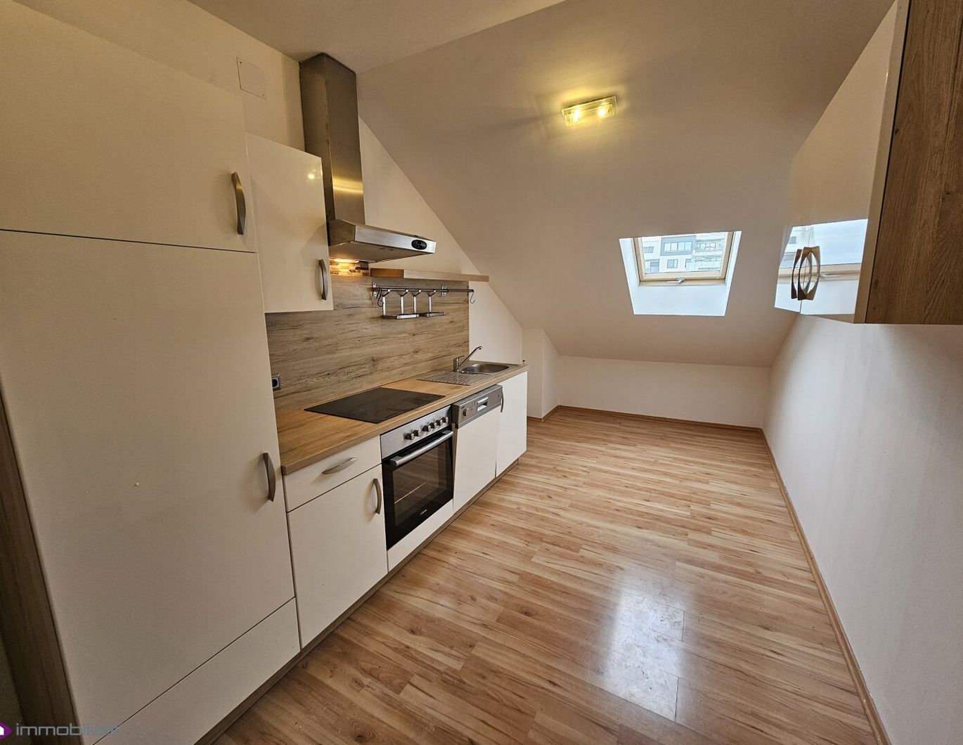 Ausrichtung N/S; Laminatböden/ Fliesen, SAT Anschluss, einfache Küche mit den gängigen Geräten (Kühl- Gefrierkombination, Geschirrspüler, Herd); die Wohnung wird ansonsten unmöbliert übergeben; Kunststofffenster/ Velux Holzfenster in der Küche
