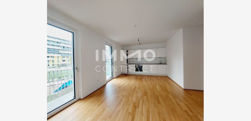 Die helle und lichtdurchflutete Wohnung besteht aus einem Schlafzimmer mit Ausgang auf den Balkon, einer offenen Küche im Wohnzimmer und ebenfalls Ausgang auf den Balkon. Erstbezug und Provisionsfrei In einer Parkähnlichen Anlage mit Tiefgarage, eigenem Spielplatz und Freifläche stehen noch 19 Wohnungen zur Vermietung frei. Eine moderne Anlage mit Top-Ausstattung, nachhaltigem Energiekonzept und eleganter Wohnambiente. Die großen Fenster bieten Ruhe, Entspannung und viel Sonnenschein. Jede Wohnung verfügt über eine Freifläche, Balkon, Terrasse oder Loggia. Die Wohnräume sind mit Holzparkett, die Nassräume mit elegantem Keramik Belag ausgestattet. Eine nagelneuen Küche rundet das Angebot ab.