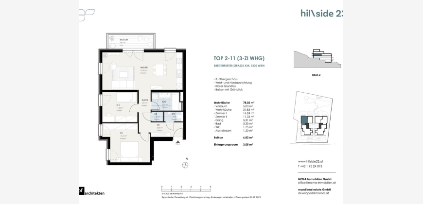 Zum Verkauf steht eine ca. 78 m² große 3-Zimmer-Dachgeschosswohnung in einem Ende 2027 fertig werdenden Neubau. Die Wohnung befindet sich im 3. Obergeschoss/1. Dachgeschoss. Die Wohnung blickt in den Erlebnisgarten Richtung Nordwesten. Zwischen den Maurer Weinbergen und dem Liesinger Bach entsteht dieses traumhafte Wohnprojekt mit zwei Wohnhäusern. In der Anlage gelangen insgesamt 28 freifinanzierte Eigentumswohnungen, die 1 bis 5 Zimmer und Wohnflächen von 50 bis 145 m² bieten. Zu allen Wohnungen gehört entweder ein Balkon, eine Terrasse oder sogar ein Eigengarten. In der hauseigenen Tiefgarage stehen 21 Kfz-Stellplätze
