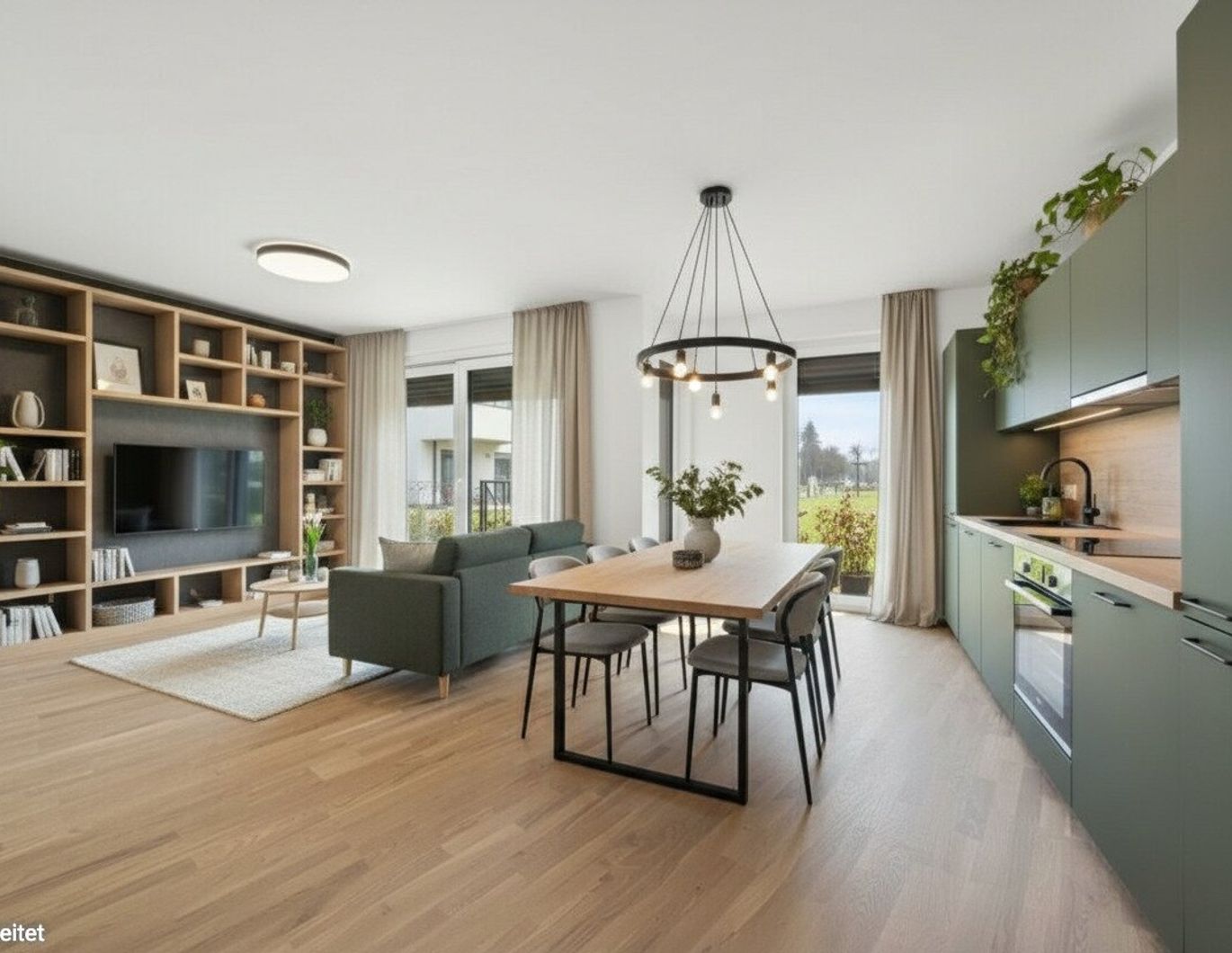 Offene Wohnküche mit Kochnische (ca. 29 m²) mit Zugang zur Loggia sowie zur Terrasse
