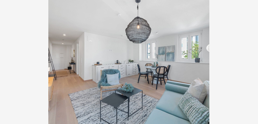 Die schöne Wohnung liegt im 2.OG und ist bequem über einen Personenaufzug zu erreichen. Nach dem Betreten der 53 m² großen 2-Zimmer-Wohnung eröffnet sich ein offener Vorraum mit knapp 9 m² Größe, welcher idealen Platz für Einbauschränke und somit viel Stauraum bietet. Unmittelbar vis à vis der Eingangstüre liegt das Schlafzimmer, welches mit über 13 m² ausreichend Fläche für ein Doppelbett, einen Schrank und eine Kommode bietet. Es verfügt über zwei Fenster, welche in Richtung Norden ausgerichtet sind. Das Badezimmer nebenan ist mit einer Dusche, einem Handwaschbecken sowie einem Waschmaschinen-Anschluss und einer Toilette ausgestattet und ist in zeitlosem warmen Beige gehalten. Es bietet viel Platz und Stauflächen. Am Ende des Vorraums eröffnet sich die rund 24 m² große Wohnküche, welche aufgrund von großen Fenstern und einer Terrassentüre wunderbar lichtdurchflutet ist. Besonders hervorzuheben sind die tiefen Fensterbänke, welche nicht nur optisch viel hermachen, sondern wunderbare Fläche zum dekorieren und für Blumenstöcke bieten. Ein perfekter Raum für gemütliche und individuelle Gestaltung mit Couch und Essbereich. Sämtliche Küchenanschlüsse für die Planung der eigenen Traumküche sind selbstverständlich vorhanden. Die entzückende Loggia in Südausrichtung weist eine tolle Größe von 9 m² auf und bietet ideale Stellmöglichkeiten für ein bequemes Sitz-Ensemble oder Lounge Möbel. Entspannten Abenden, oder einem Frühstück im Freien steht nichts mehr im Wege. Abgerundet wird das Wohnungsangebot durch ein zugehöriges Kellerabteil mit 1,66 m² Größe. Zusammengefasst besticht die Wohnung durch gekonnte architektonische Planung und gemütliches Flair. Derzeit stehen noch 3 Stellplätze in der hauseigenen Garage um je 45.000,00 Euro zum Kauf zur Verfügung. Zusätzlich steht den zukünftigen Eigentümern auch die Möglichkeit zum Erwerb eines Gartens in der Größe von 31-51 m² offen. Eine absolute Rarität, um seine eigenen Kräuter und Gemüse anbauen zu können.