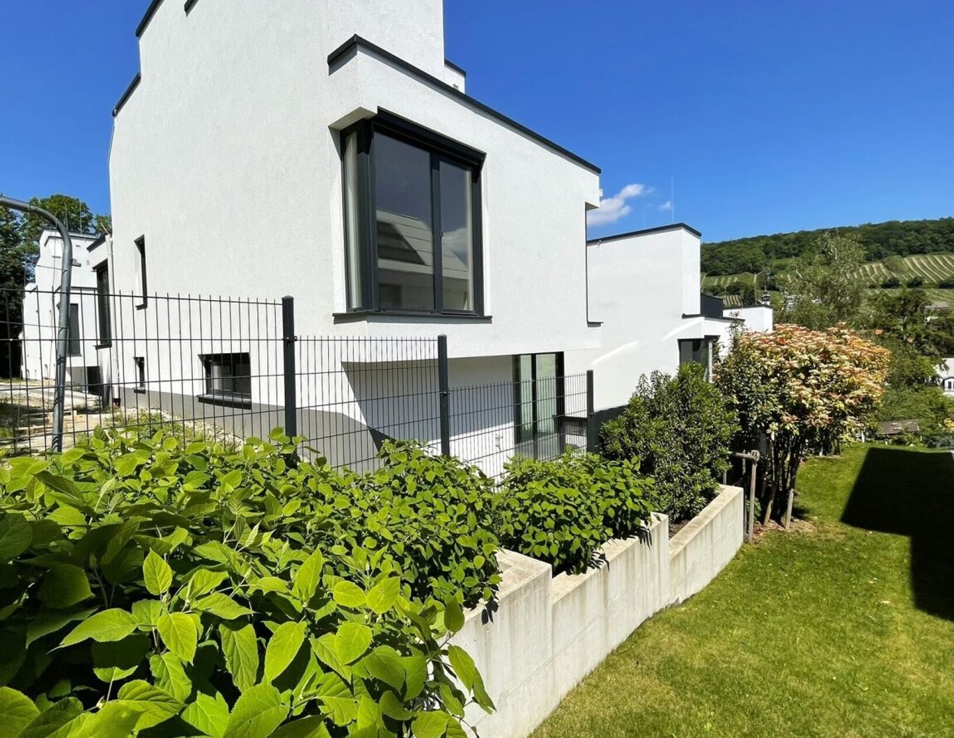 Der Weitblick auf die Döblinger Weinberge lädt zum Genießen ein, ob von der Aussichtsterrasse, vom Wohnzimmer oder den wunderschön angelegten Gärten.