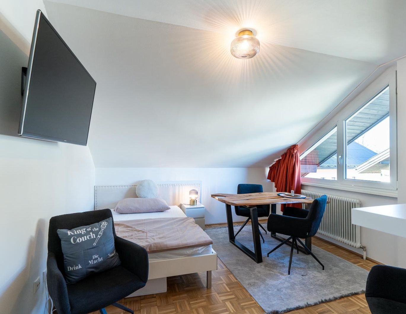Zur Ausstattung der Wohnung gehören: Großer Arbeits & Esstisch Flachbildfernseher Wlan-Router Geräumiger Kleiderschrank Komfortables Kingsize-Bett Stilvolle Dekoration Fernwärme