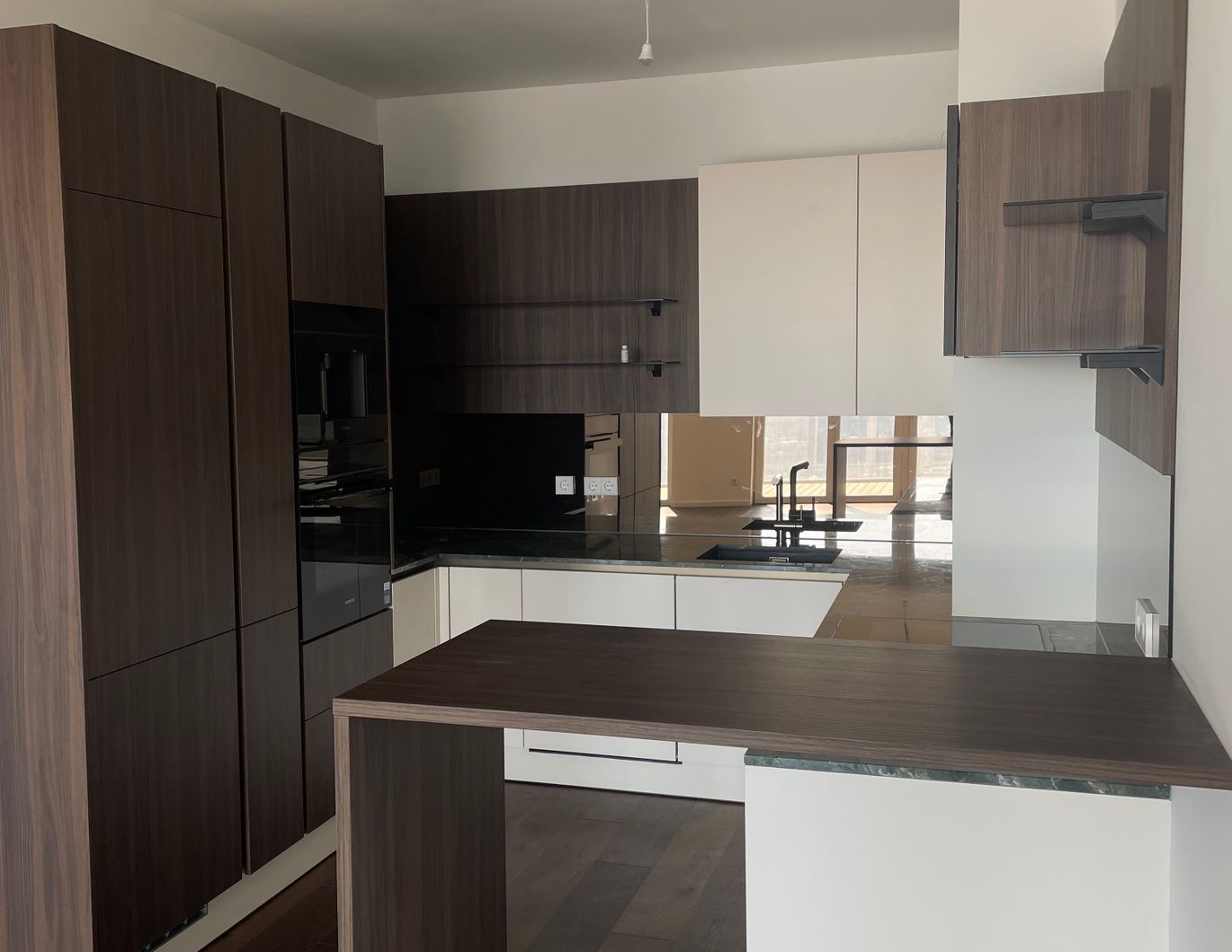 Wohnbereich mit voll ausgestatteter Luxusküche (Kaffeemaschine, Dampfgarer, hochwertige Steinplatte sowie Holzschänke) sowie Wohnzimmer und kleiner Arbeitsbereich mit Balkonzugang
